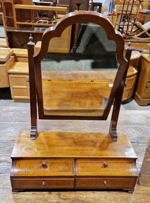 Early 20th century mahogany inlaid swing dressing mirror in the Queen Anne manner, the shaped plate over a base with four small drawers, on ogee bracket feet, 68cm high x 50cm wide