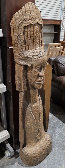 Hardwood carved sculpture of a South East Asian figure with decorative headdress and necklace, 144cm high x 35cm wide