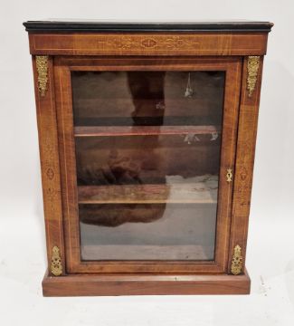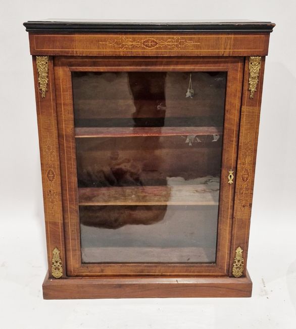 Victorian inlaid walnut pier cabinet with ormolu mounts, the single glazed door opening to two fabric lined shelves, on plinth base, with key, 99cm high x 76cm wide x 32cm deep