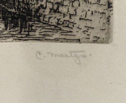 "Brighton Chain Pier", signed lower right, unframed, 23cm x 37.5cm, together with five further etchings by various artists to include Sir David Young Cameron (1865 - 1945), Edward Sharland (1884-1967) etc. (6)