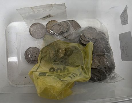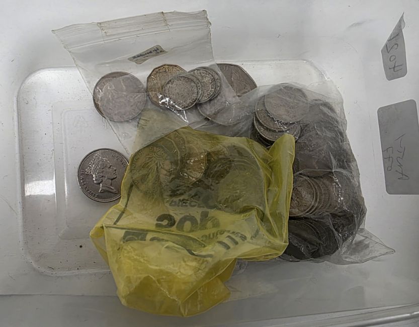 Collection of British coins mainly pre-decimal including a George V silver 1921 and 1922 florins, nine George V sixpence coins, nine George V threepence coins, various other coins and two banknotes