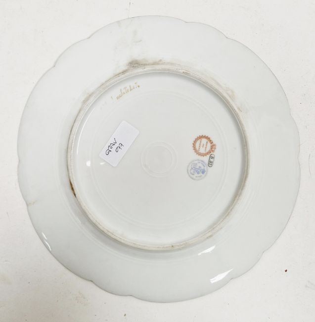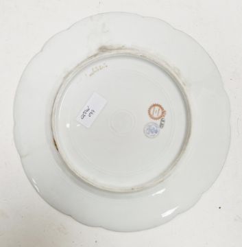 Sevres-style turquoise ground plate, late 19th century, spurious printed Sevres marks S.37 and Chateau des Tuileries marks, indistinctly inscribed in gilding Chatelet, painted with a bust-length portrait of a women in court dress within gilt frond cartouche, the border with bouquets of flowers within a lobed gilt lined rim, 24cm diameter
