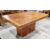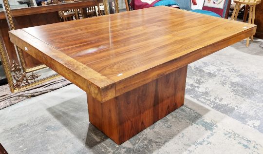 A contemporary walnut and burr walnut veneer extending dining table by Elite Interiors of Montreal Canada, the rectangular top with two additional leaves, on a large rectangular pedestal support, 75cm high x 153cm long (additional leaves 46cm each) x 104cm wide