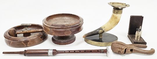Mixed lot of wooden items including a specimen wood fruit bowl and nutcracker bowl with hammer, a nutcracker carved in the form of an old woman, a Boosey & Hawkes bagpipes practice chanter, an oak bookend with a spelter terrier and a horn mounted with a brass ashtray