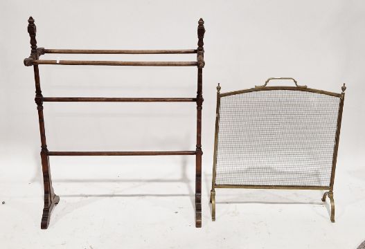 Edwardian beechwood towel rail with turned ring supports, 95cm high x 73cm long together with a brass firescreen with mesh panel, 67cm high x 57cm wide (2)