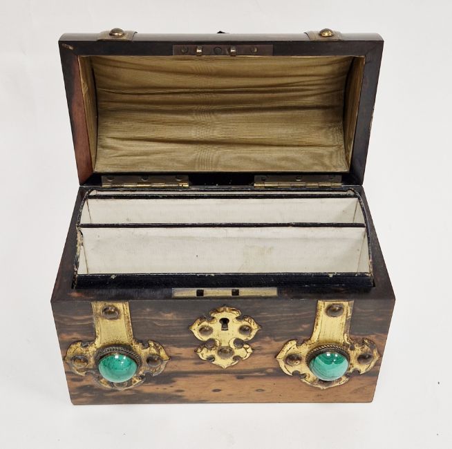 Victorian coromandel stationery/letter box of domed form having brass strapwork decoration and malachite roundels, the hinged lid opening to three sections and brass makers plaque for 'Edwin Bradford of Torquay', 13cm high