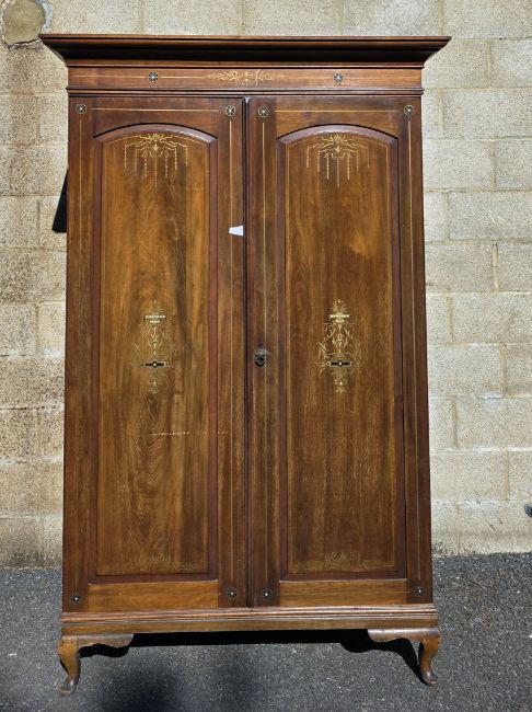 Edwardian mahogany inlaid wardrobe, the moulded cornice over two panel doors opening to a hanging space, on short cabriole legs, 214cm high x 137cm wide x 59cm deep