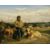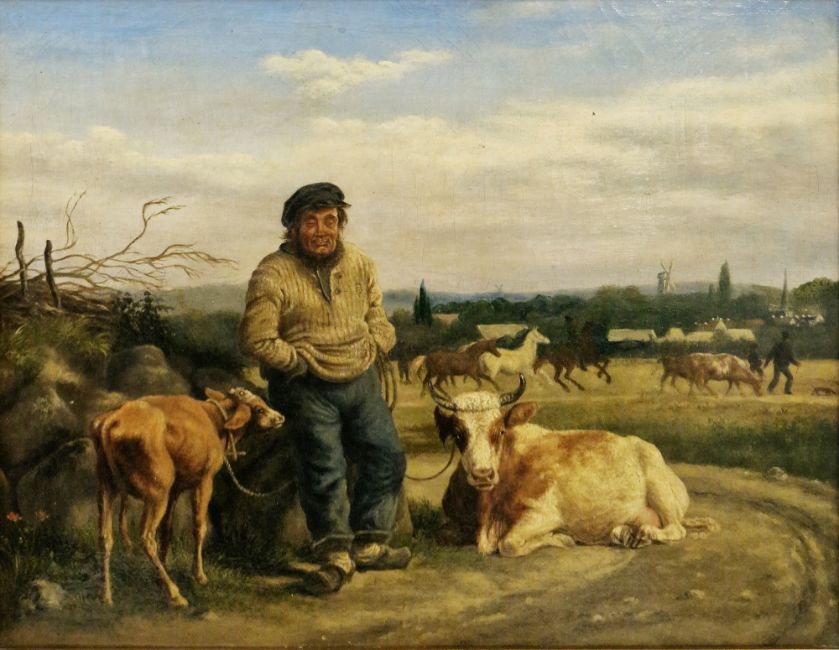 Rural scene of farmer with cow and calf, horses, figure and town beyond, 29cm x 37cm