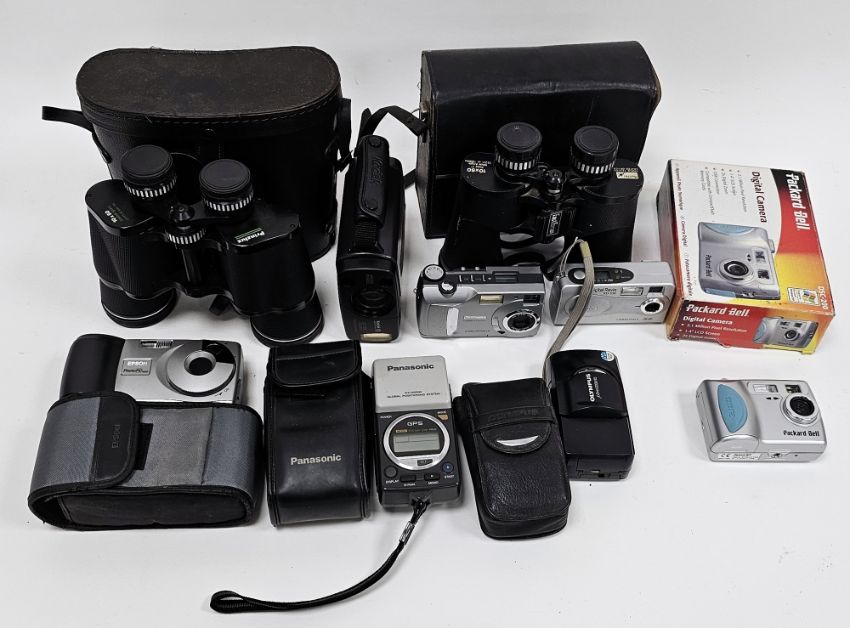 Collection of cameras, equipment and binoculars including a Packard Bell DSC-200 digital camera, an Olympus zoom 105 camera, an Epsom Photo PC600 camera, a Konica digital revio KD-100 camera, a Kodak DC120 zoom digital camera, a Panasonic KX-G5500 global positioning system and two cased binoculars