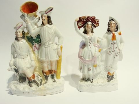 Two Staffordshire flatback spill vase figure group, "Huntsman" and another figure groups of man and woman and a painted terracotta plaque
