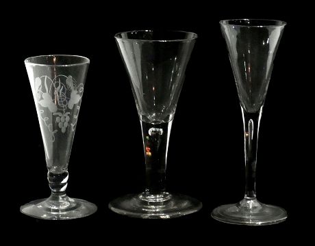 Georgian wine glass with drawn trumpet bowl and teared stem, raised on a circular folded foot, height 17cm together with another with vine and barley engraving, on double knopped stem and a further trumpet drawn bowl glass with teardrop stem, circular foot (3)