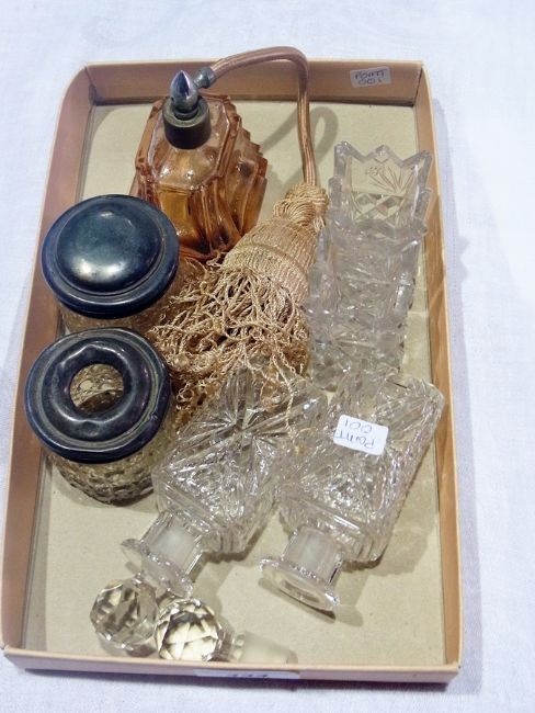A quantity of cut glass to include a pair of bottles and stoppers, a pair of miniature vases, hair tidy and another jar, both with silver mounts and lid and a coloured glass scent bottle