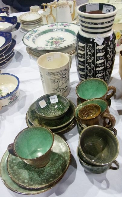 Tykes Motto pottery mug, Studio pottery black and white vase, quantity studio pottery teacups and saucer in mottled green glaze