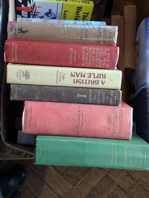 Belloc, Hilaire "Six British Battles" Arrowsmith 1931, red cloth, dust jacket, Sturgis, Julian (Ed) "A boy in the Penisula War.. Robert Blakeney ..." John Murray 1899, a folding map, Simmons, Major George "A British Rifleman ..." Napoleonic Library, Green Hill Books 1986, dust jacket, various novels and a collection of books on Antiques and Antique Collecting (2 boxes)