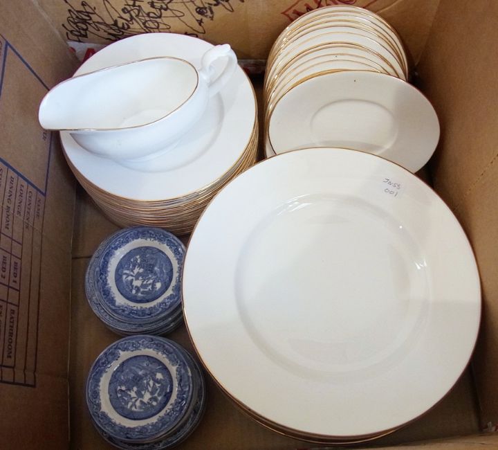 Royal Grafton "First Love" part service, white ground with gold rim, various dinner plates, side plates, tea plates and various dolls'/childrens' blue and white willow pattern plates (1 box)
