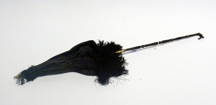 Victorian parasol with carved folding wooden handle, black silk tassel shade and carved bone finial