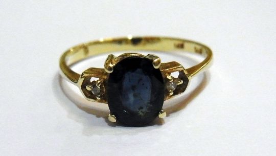 14K gold and blue stone ring, set oval facet-cut stone and pair tiny diamonds to shoulders