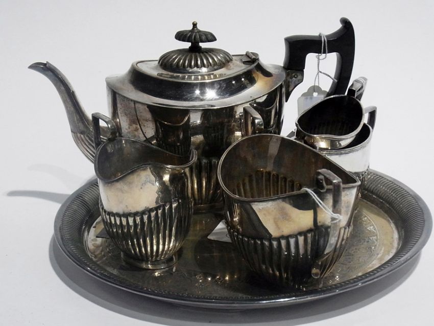 Silver plated three-piece tea service together with a small sugar bowl and jug and a salver