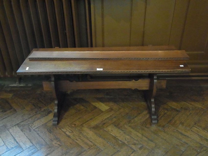 Mahogany-topped occasional table, rectangular with chip carved edge, on shaped standard supports (af)