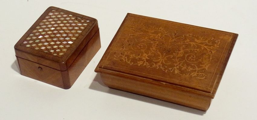 19th century mother-of-pearl and brass inlaid rosewood writing slope, interior missing, inlaid figured wood trinket box and another inlaid with mother-of-pearl chequering (3)