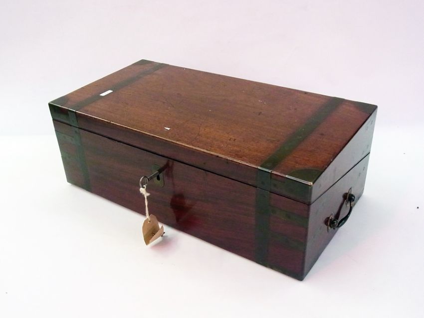 19th century brass inlaid mahogany writing slope from N Middleton Retailers, having fitted interior with retailer's label, single side drawer, all with brass banding, corners and brass drop handles, 51cm wide approx.