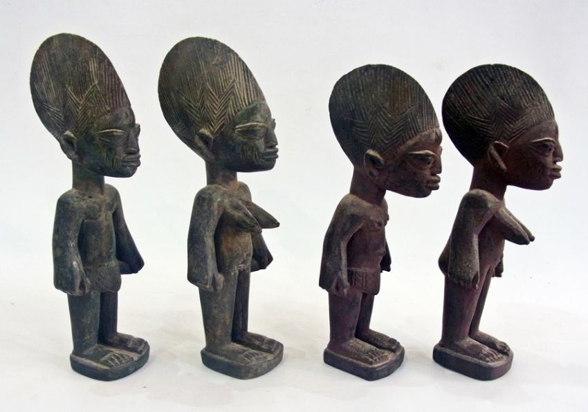 Two pairs of carved wooden Nigerian male and female figures having ornate headdresses