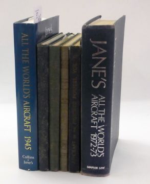 "Jane's All the World's Aircraft 1945: collector's edition", Harper Collins (1994), blue cloth, dust jacket, "Jane's All the World Aircraft 1972-73", ex-library and four other Jane's volumes 1944 "Aircraft of the Fighting Powers" (6)