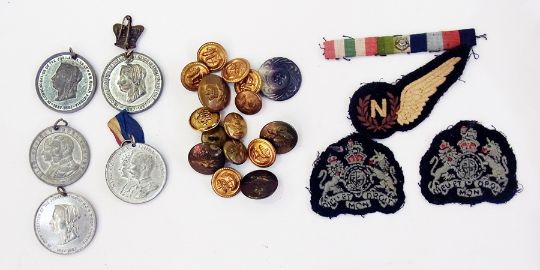 Quantity military buttons including Naval, five Victorian and George V Jubilee medallions and various military badges