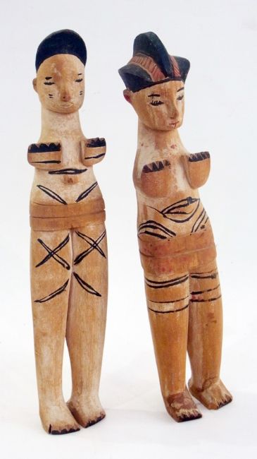 Two pairs of carved wooden Nigerian male and female figures having blue tint, another smaller pair, all with ornate headdresses and two female carved wooden figures