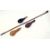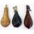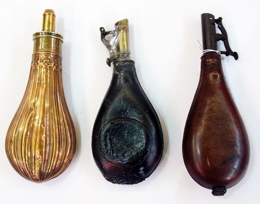 Copper powder flask, another, two leather powder flasks and shotgun barrel cleaner (4)