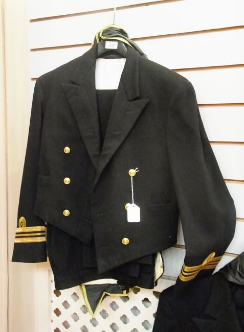 Two mid 20th century naval dress uniforms, one with short jacket and waistcoat, labelled "Gieves" and dated 1966, the other with double breasted long jacket and ribbons, all with brass buttons together with two leather mounted suitcases