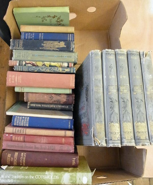 The Strand Musical Magazine, vols. 1, 2, 3, 4 & 5 dated 1895, 1896, 1897, pictorial cloth, backstrips chipped and worn St. Clair Baddeley, Welbore "A History of Cirencester", printed Cirencester Newspaper Company 1924, numerous folding maps, illustrations, etc. red cloth, quarter-leather with gilt titles Various agricultural books including "Farmers & Stockbreeder Year Book 1950", "The Uses of Elliman's Embrocation for Horses, Dogs, Birds and Cattle", 3rd edition 1902, black and white illustrations, red cloth, gilt titles and similar, 5th edition 1906, "A 1910 Album of Agricultural Machinery" McConnell, Primrose "Notebook of Agricultural Facts and Figures for Farmers and Farm Students", Crosby Lockwood & Son 1910, full leather "Buffon's Natural History:... Birds, Bees, Fishes, Reptiles, Insects, etc.", Milner & Co Limited, numerous plates, red cloth, gilt titles, but very worn and hinges cracked and other volumes (1 box)