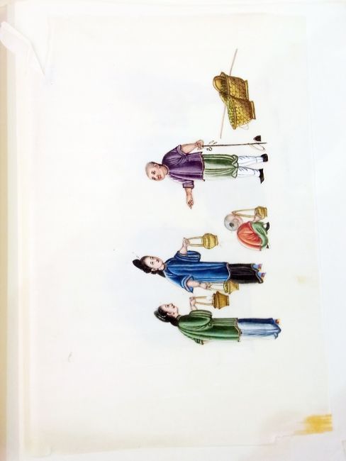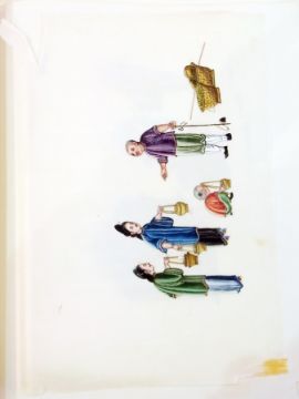 Album of ten Chinese watercolours on rice paper, figures planting, figures with baskets, interior scenes and others (some af)