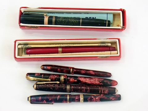 Swan fountain pen in original box with guarantee and instructions, a Swan Visofil black and clear mottled and black fountain pen with original instructions, a Burnham pen and three others