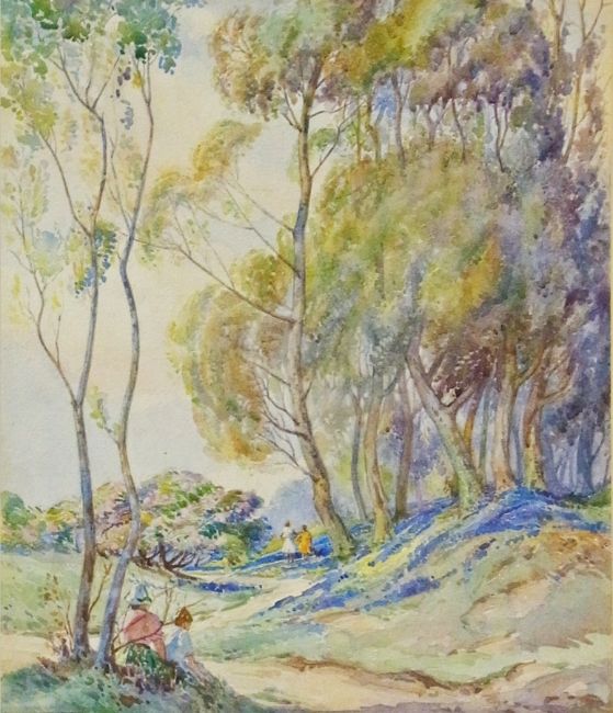 Watercolour drawing Edward Neatby (1888-1949) Figures on a woodland path with bluebells, signed lower left, 33cm x 28cm
