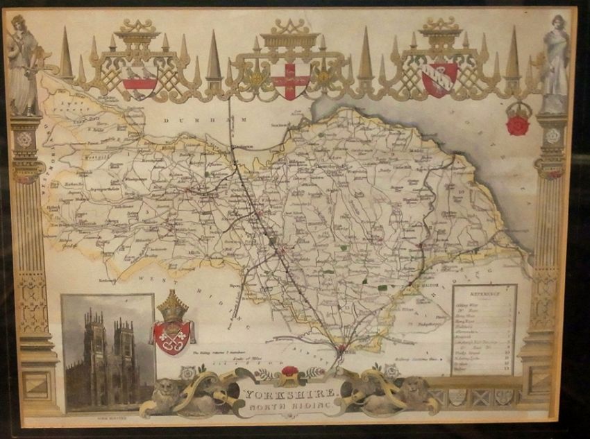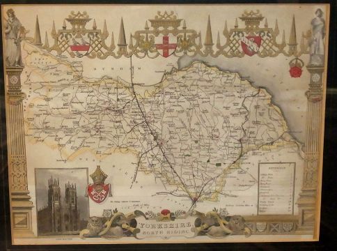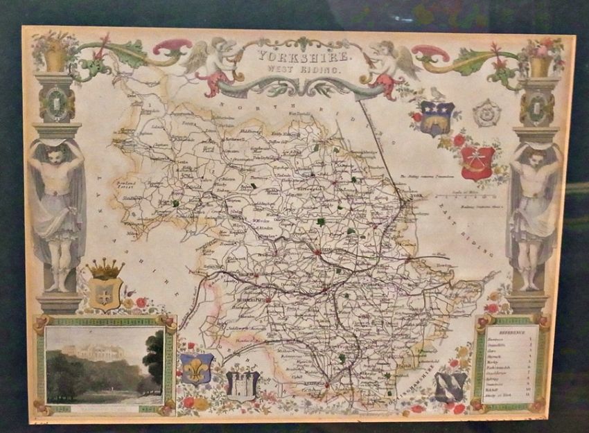 Three handcoloured 19th century maps of Yorkshire North Riding, Yorkshire West Riding and Bedfordshire together with handcoloured engraved picture and description of Bedford Bridge and Bedford Bridge Take Two and a woolwork picture (6)