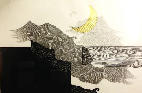 Print Reiten Iwami (b.1927) Japanese school, a screen print stylised image of wood, waves and gold moon, possibly water around a pier, 56cm x 80cm, entitled and signed in pencil