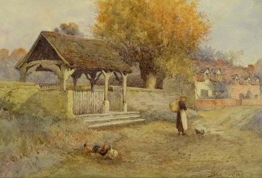 Watercolour on board George Hughes "Lychgate in Hampshire", rustic scene with woman feeding chickens beside Lychgate, signed, 17cm x 24.5cm (unframed)