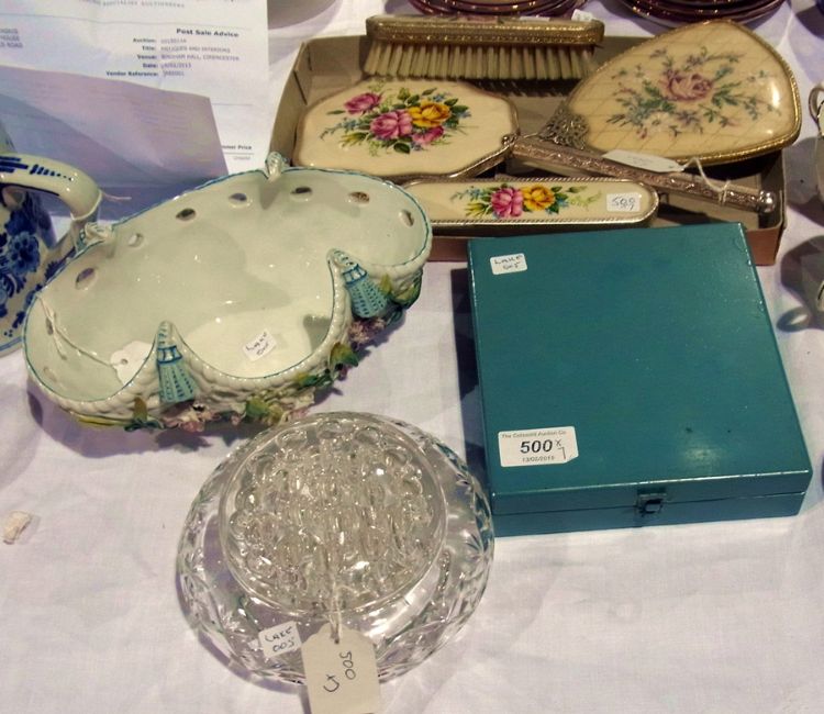 Continental porcelain bowl of shaped oval form with pierced decoration and applied flowers together with glass rose bowl, a metal cased set of dressing table jars and a mirror and brush set