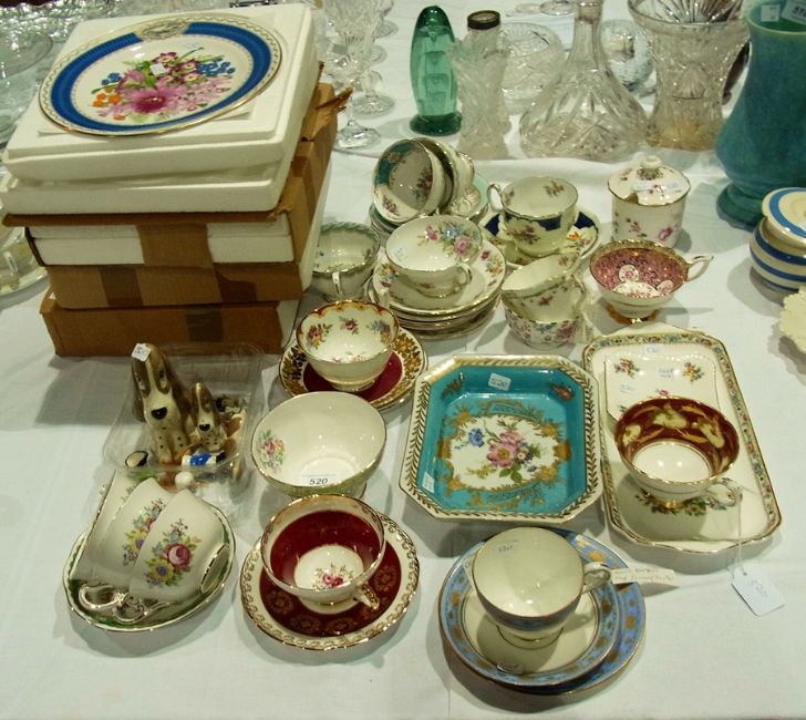 Quantity Adderley Royal Stafford and other china cabinet cups and saucers, three Seizler model dogs, Spode commemorative plate and other ceramics