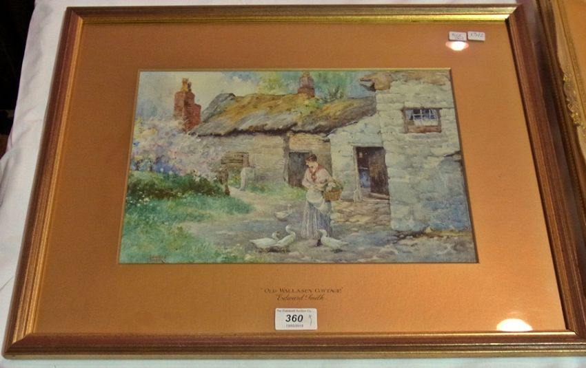 Watercolour drawing Edward Smith (exh.1904-1923) Woman with basket of vegetables feeding ducks outside farm cottage, entitled on mount "Old Wallasey Cottage" and stamped with artist's name, signed, Edward Smith was the son-in-law of David Woodlock (1842-1929) and paints in a very similar manner, see verso for gallery label showing alternative thoughts to artist, 24cm x 34cm