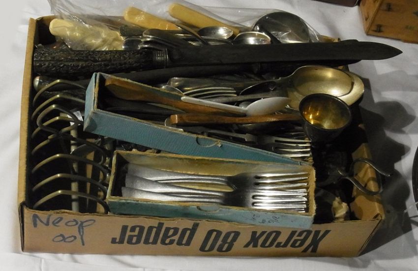 A horn-handled carving knife, fork and steel, various silver plated flatware, bone-handled knives, toast rack, etc. (1 box)