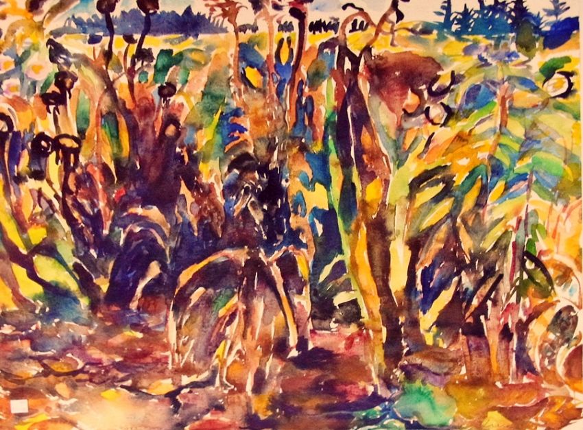 Gouache drawing David Weddal(?) Woodland scene with tunnel of trees, signed indistinctly and titled "Treescape", 43cm x 55cm together with Watercolour drawing Large abstract, indistinctly signed lower right and dated 87, 57cm x 75cm