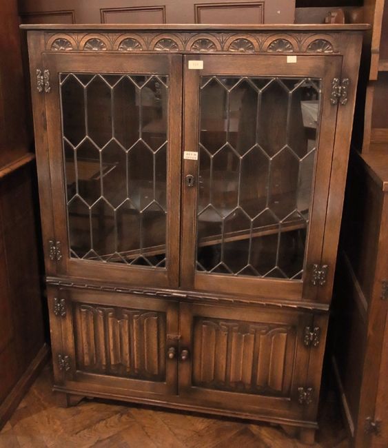 Reproduction carved oak old charm style display cabinet, the upper section enclosed by pair leaded glazed doors, the cupboard below with linen-fold panel doors, 94cm wide