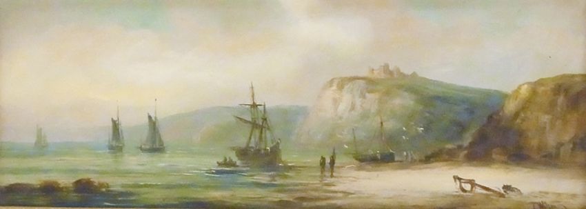 Oil on board Thomas Walter Wilson (1851-1912) Seascape showing a beach with fishing boats and ruined castle on top of hill in the background, signed lower right T. Wilson, 15cm x 38.5cm