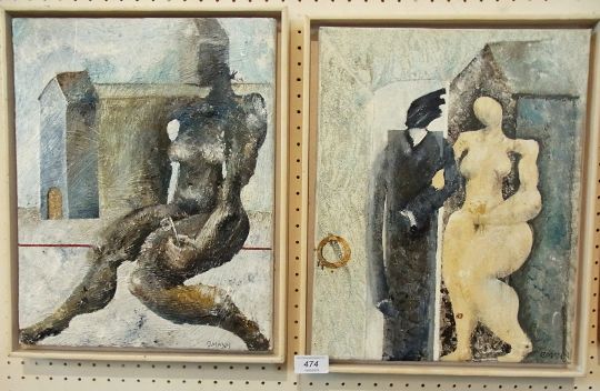 Pair oils on canvas Hans Peter Omann, 20th century school Stylised figures beside buildings entitled on reverse "Layers of Reality Key" and "Homecoming", signed, 37cm x 30cm