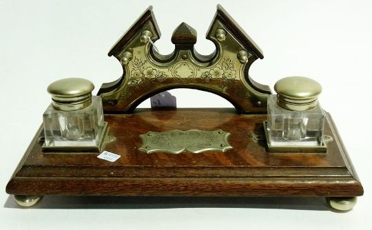 An Edwardian wooden ink stand with a plated mount inscribed with "S.C.E.D 1906" and two glass inkwells