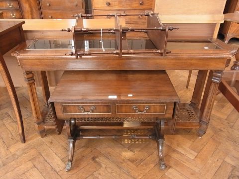 A narrow glass top side table on square legs, with a cane panel shelf below, with a small wall bracket and a reproduction drop flap coffee table (3)