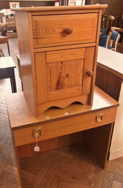 Modern pine cupboard with drawer and cupboard below, a contemporary side table with fitted drawer together with a Schreiber upholstered stool and a small contemporary writing table (4)