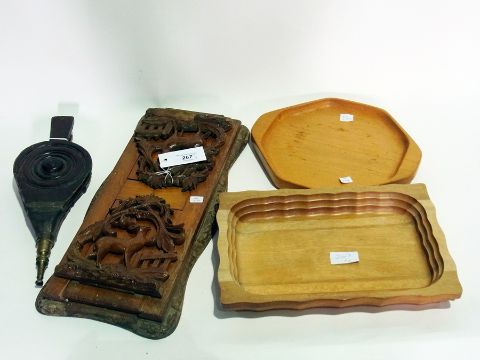 Carved book rest, pair small fire bellows, two wooden carved trays, a copper warming pan with turned wood hand and other sundry items (5)